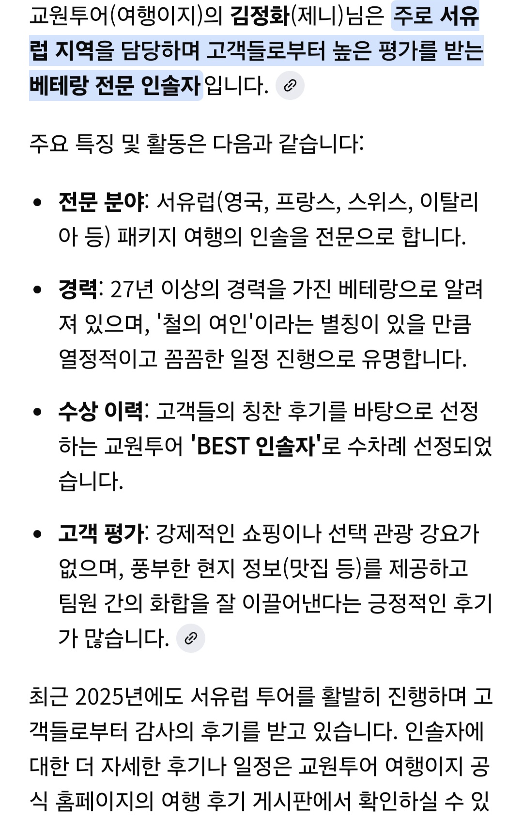 특히 제니 최고에요! 검색해보니까 진짜 나옴 ai 이미지 첨부합니닼ㅋㅋ 그리고 얼굴은 보지 않았지만 고생 많으셨을 우리 조은별 과장님 상담자 님도 감사합니다 교원투어 여행이지 분들, 평생 잊지 못할 추억 만들어주셔서 고마워요..